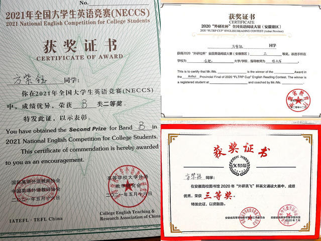 熱愛可抵歲月漫長,溫柔可擋艱難時(shí)光。在校期間,方紫鈺參加了大學(xué)生藝術(shù)團(tuán)器樂隊(duì),并與志同道合的伙伴們一同組建了校民樂團(tuán),參加了很多校內(nèi)大大小小的文藝匯演,編排了《春節(jié)序曲》《金蛇狂舞》《大魚》等經(jīng)典曲目。匯演受到了師生們的一致好評(píng),方紫鈺在此期間也結(jié)識(shí)了很多有趣的朋友,為自己的大學(xué)生活添上了濃墨重彩的一筆。良好的興趣不僅能夠豐富自己的大學(xué)生活,更是在繁重而忙碌的學(xué)業(yè)中起放松身心作用的調(diào)適劑。而專業(yè)方面,方紫鈺也在發(fā)光發(fā)熱,在全國大學(xué)生英語競(jìng)賽、“外研社杯”全國英語閱讀大賽和“外研訊飛”杯英語誦讀大賽中都獲得了優(yōu)異的成績。