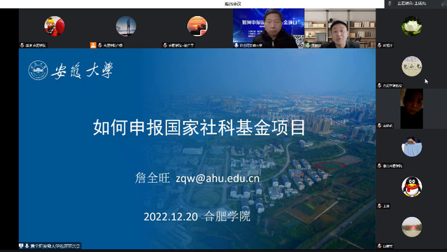 1220日下午,安徽大學(xué)外國(guó)語學(xué)院院長(zhǎng)、國(guó)家社科基金項(xiàng)目、教育部人文社科規(guī)劃基金項(xiàng)目、國(guó)家留學(xué)基金項(xiàng)目、安徽省哲學(xué)社會(huì)科學(xué)規(guī)劃項(xiàng)目評(píng)審專家詹全旺教授應(yīng)邀通過騰訊會(huì)議,進(jìn)行了“如何申報(bào)國(guó)家社科基金項(xiàng)目”的學(xué)術(shù)報(bào)告。此次報(bào)告由??蒲刑幒屯鈬?guó)語學(xué)院主辦、??茀f(xié)協(xié)辦,是學(xué)?!澳掀G湖大講堂學(xué)術(shù)報(bào)告”系列之一。