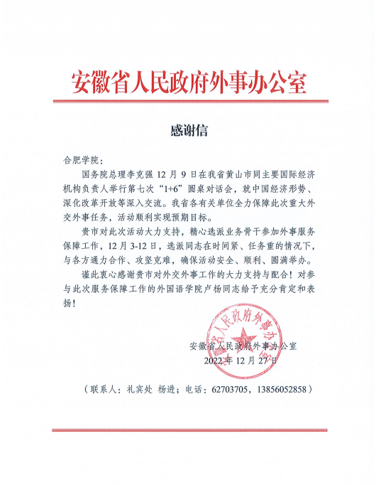 能參與國(guó)家重大外交外事活動(dòng)服務(wù)保障工作,是我校全體師生的光榮。近日,安徽省人民政府外事辦公室向我校發(fā)來(lái)感謝信,對(duì)參與此次服務(wù)保障工作的外國(guó)語(yǔ)學(xué)院盧楊同志給予充分肯定和表?yè)P(yáng)。(撰稿:王雨濛;審核:吳孔寶)