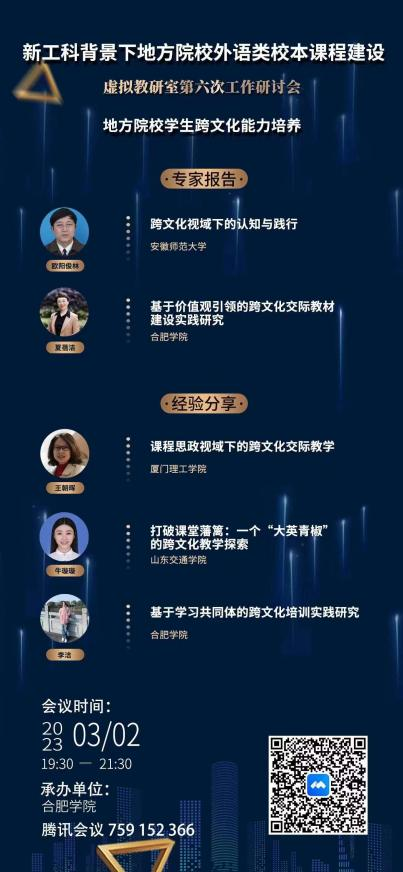 3月2日晚19點30分至22點,由外國語學院主辦的“新工科背景下地方院校外語類校本課程建設”虛擬教研室第六次工作研討會如期召開。本此研討會主題為“地方院校學生跨文化能力培養(yǎng)”。