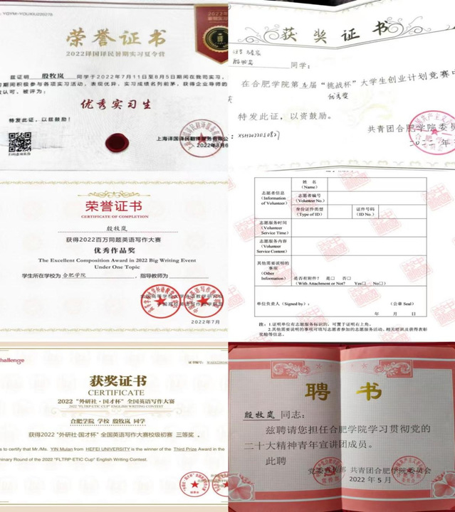 立身以立學(xué)為先,立學(xué)以讀書為本。倘若沒有自律和刻苦的學(xué)習(xí),想要在其他方面發(fā)光發(fā)熱便也成了空談。寶劍鋒從磨礪出,梅花香自苦寒來。在平時的學(xué)習(xí)中,殷牧嵐就以高標(biāo)準(zhǔn)嚴(yán)格要求自己,高效完成老師布置的學(xué)習(xí)任務(wù),養(yǎng)成了良好的學(xué)習(xí)習(xí)慣。人所實踐之目標(biāo),是其銳志,是其上進與希望。入學(xué)伊始,殷牧嵐就為自己規(guī)劃了清晰的未來,并制定計劃不斷前行。在校期間,她憑借自身的努力獲得了校級一等獎學(xué)金和三等獎學(xué)金、外研社杯閱讀比賽一等獎、外研社寫作三等獎等眾多獎項,并以此為動力,堅持“聽不懂的文章反復(fù)磨練,學(xué)不懂的知識往深處鉆研”,樂思篤學(xué),行而致遠。
