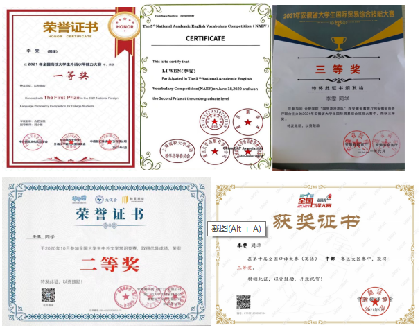 無論是在平常的學(xué)習(xí)與生活中,還是在考研道路上,李雯從來都不會(huì)輕言放棄。在大學(xué)期間,李雯收獲了諸多榮譽(yù),在自己專業(yè)的領(lǐng)域發(fā)光發(fā)熱,2020年6月18日獲得第五屆全國大學(xué)生學(xué)術(shù)英語詞匯大賽全國二等獎(jiǎng)、2021年5月15日獲得全國高校大學(xué)生外語水平能力大賽一等獎(jiǎng)、2021年9月5號(hào)獲得第十屆全國口譯大賽(英語)大區(qū)賽三等獎(jiǎng)、2021年11月獲得第五屆”億學(xué) 新東方“全國大學(xué)生英語詞匯及綜合能力大賽省一獎(jiǎng)……面對(duì)強(qiáng)大的對(duì)手,李雯仍能保持沉靜,賽出自己的風(fēng)采。比賽不僅是對(duì)李雯個(gè)人能力的檢驗(yàn)與磨練,更成為了她走向成功的階梯,助力她連續(xù)四年獲得校獎(jiǎng)學(xué)金和優(yōu)秀學(xué)生干部稱號(hào),并于2023年3月被評(píng)為安徽省優(yōu)秀畢業(yè)生和合肥學(xué)院優(yōu)秀畢業(yè)生。