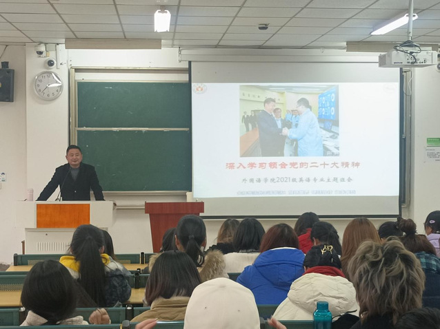 12月6日下午,輔導(dǎo)員吳孔寶組織召開主題班會(huì),向外國(guó)語學(xué)院2021級(jí)英語專業(yè)72名學(xué)生宣講黨的二十大精神。吳老師向大家介紹了中央黨史和文獻(xiàn)研究院院長(zhǎng)曲青山撰寫的文章《深入學(xué)習(xí)領(lǐng)會(huì)黨的二十大精神》,從深入學(xué)習(xí)領(lǐng)會(huì)黨的二十大的重大意義、深入學(xué)習(xí)領(lǐng)會(huì)黨的二十大的主題、深入學(xué)習(xí)領(lǐng)會(huì)過去五年工作和新時(shí)代十年偉大變革的重大意義、深入學(xué)習(xí)領(lǐng)會(huì)習(xí)近平新時(shí)代中國(guó)特色社會(huì)主義思想的世界觀和方法論、深入學(xué)習(xí)領(lǐng)會(huì)以中國(guó)式現(xiàn)代化全面推進(jìn)中華民族偉大復(fù)興的使命任務(wù)、深入學(xué)習(xí)領(lǐng)會(huì)對(duì)未來五年黨和國(guó)家各項(xiàng)事業(yè)發(fā)展的戰(zhàn)略部署、深入學(xué)習(xí)領(lǐng)會(huì)以黨的偉大自我革命引領(lǐng)偉大社會(huì)革命的重要要求和深入學(xué)習(xí)領(lǐng)會(huì)發(fā)揚(yáng)斗爭(zhēng)精神、增強(qiáng)斗爭(zhēng)本領(lǐng)、堅(jiān)持團(tuán)結(jié)奮斗的時(shí)代要求等八個(gè)方面需要關(guān)注的重大問題,對(duì)黨的二十大精神進(jìn)行了宣講。