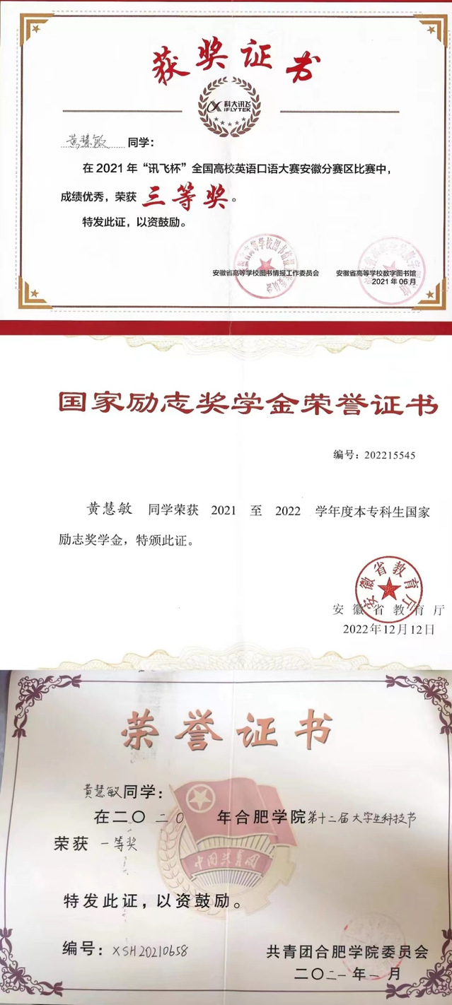 回首過往,黃慧敏用“充實(shí)”二字概括和總結(jié)了自己四年的大學(xué)生涯。進(jìn)入大學(xué)之初,她不但積極調(diào)整自身的學(xué)習(xí)狀態(tài),而且樂于參加各種比賽和活動(dòng)來提升自己的綜合素質(zhì)能力?!疤幚硎虑楹蛥⒓颖荣愐沧屛业玫搅隋憻挕1热缱屛覍W(xué)會(huì)如何處理人際關(guān)系,如何更有效地學(xué)習(xí),如何處理好情緒……”千里之行,始于足下。任何成就的背后都有夜以繼日的努力支撐著。黃慧敏對(duì)自己有著清晰的規(guī)劃,通過合理分配每一天的時(shí)間,確保既能有良好的學(xué)習(xí)效果,又能有空余時(shí)間去參加感興趣的活動(dòng)。這四年里,她曾多次榮獲“三好學(xué)生”稱號(hào),獲得國家勵(lì)志獎(jiǎng)學(xué)金、校級(jí)獎(jiǎng)學(xué)金、2020年合肥學(xué)院第十二屆大學(xué)生科技節(jié)一等獎(jiǎng)、2021年“訊飛杯”全國高校英語口語大賽安徽分賽區(qū)三等獎(jiǎng)。