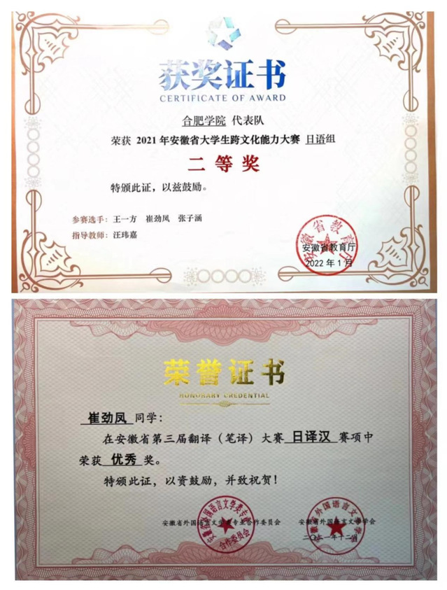 崔勁鳳在班級(jí)里成績(jī)一直名列前茅,在自己努力學(xué)習(xí)的同時(shí),也耐心幫助同學(xué)解決學(xué)習(xí)上的困難。她在完成學(xué)習(xí)任務(wù)之余,也積極參加各種比賽:在2021年安徽省大學(xué)生跨文化大賽中獲得二等獎(jiǎng),在安徽省第三屆翻譯大賽獲得優(yōu)秀獎(jiǎng)。大海憑魚躍,天高任鳥飛。新時(shí)代的中國為青年提供了廣闊的海域與浩瀚的蒼穹,青年自身應(yīng)有徜徉于天地的覺悟,展現(xiàn)出不懼路遠(yuǎn)的志向。