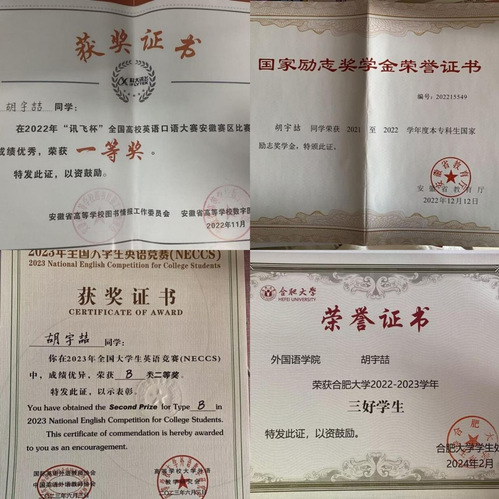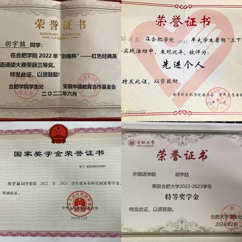 除了刻苦學(xué)習(xí)書本知識以外,她積極參與各類學(xué)術(shù)競賽,開闊眼界、豐富閱歷,并憑借扎實(shí)的知識儲備和敏銳的思維能力,在競賽中屢創(chuàng)佳績。曾獲得2022年“訊飛杯”全國高校英語口語大賽省級一等獎(jiǎng)、大學(xué)生英語競賽B類二等獎(jiǎng)等。這些榮譽(yù)的背后,是她無數(shù)個(gè)日夜的努力和汗水的積累。此外,她熱衷于參加各項(xiàng)文藝活動(dòng),榮獲2022年合肥學(xué)院第十九屆校園文化藝術(shù)節(jié)一等獎(jiǎng)。