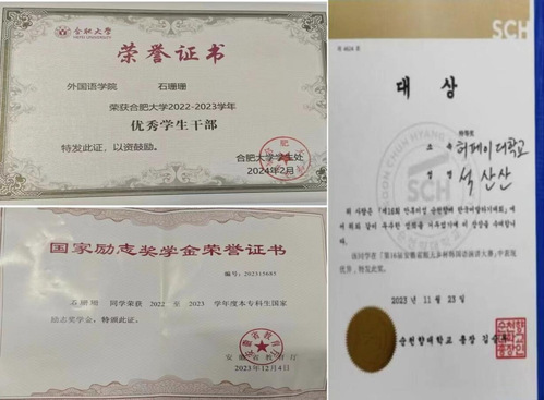 在兼顧學(xué)習(xí)的情況下,石珊珊還積極參與各類比賽,并在許多比賽中為學(xué)校爭(zhēng)光。在第十六屆安徽省順天鄉(xiāng)韓語(yǔ)演講比賽中,她榮獲省級(jí)第一名黨的二十大報(bào)告翻譯比賽中,她拿下校級(jí)三等獎(jiǎng)的榮譽(yù);在合肥-原州締結(jié)友好關(guān)系20周年慶典活動(dòng)上,石珊珊作為學(xué)生代表與韓國(guó)原州市市長(zhǎng)元康修進(jìn)行親切交流并合影留念。另外,她還曾獲兩次國(guó)家勵(lì)志獎(jiǎng)學(xué)金,校級(jí)二、三等獎(jiǎng)學(xué)金,兩次校級(jí)三好學(xué)生榮譽(yù)稱號(hào)以及兩次校級(jí)優(yōu)秀學(xué)生干部榮譽(yù)稱號(hào)。