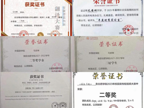 在校期間,毛安琳同學(xué)積極參加各項(xiàng)志愿服務(wù),榮獲2022年世界制造業(yè)大會(huì)“優(yōu)秀志愿者”、全國(guó)中學(xué)生英語(yǔ)能力測(cè)評(píng)“優(yōu)秀志愿者”、臨湖社區(qū)愛心學(xué)堂“年度優(yōu)秀志愿者”等稱號(hào),還參與2022年合肥市新能源汽車全球人才招聘會(huì)、2023年中國(guó)航天日志愿服務(wù)以及海恒社區(qū)青春助力志愿服務(wù)等社會(huì)實(shí)踐三十余項(xiàng),均取得出色成果。除此之外,她還帶隊(duì)打造了一系列鄉(xiāng)村振興社會(huì)實(shí)踐項(xiàng)目,在國(guó)家級(jí)大學(xué)生創(chuàng)新創(chuàng)業(yè)訓(xùn)練計(jì)劃中,她主持的項(xiàng)目獲批1個(gè)國(guó)家級(jí)立項(xiàng),2個(gè)省級(jí)立項(xiàng)。毛安琳參加并入圍了合肥大學(xué)第十九屆“榜樣學(xué)子”評(píng)選活動(dòng)。