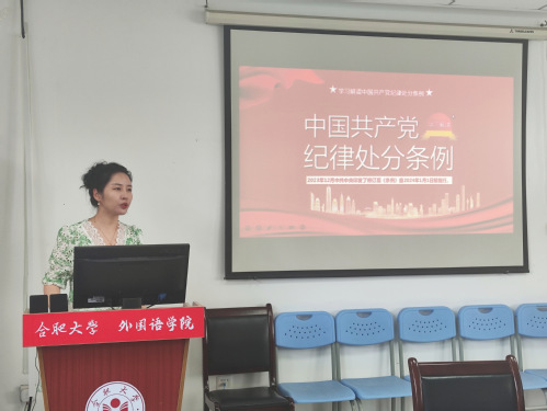 根據(jù)學(xué)院黨紀(jì)學(xué)習(xí)教育計(jì)劃安排,6月12日,外國(guó)語(yǔ)學(xué)院學(xué)生第一黨支部書記李菲菲,以“學(xué)習(xí)解讀中國(guó)共產(chǎn)黨紀(jì)律處分條例”為主題,支部全體黨員上了一次專題黨課。