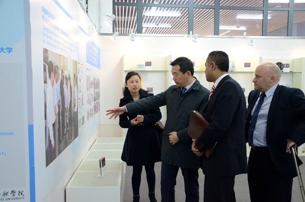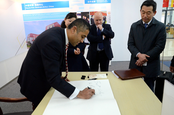 期間,英國德比市代表團一行參觀了中德共建合肥學院三十周年成果展。張文兵從合肥學院發(fā)展狀況、國際化合作以及中德合作專業(yè)學術(shù)交流等方面介紹了我校的整體情況,以及中外師生交流、文化交流、科研合作、專業(yè)共建等多類合作項目開展情況。拉杰·邦威在留言臺寫下對合肥學院的衷心祝福。