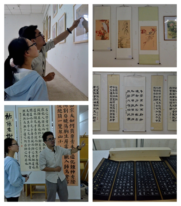 展覽匯集了翰墨軒會員胡明忠、劉生、石飛翔、葉寧祁、熊祿澤五位同學(xué)近一年的精心準(zhǔn)備的書畫作品,政協(xié)合肥之友書畫院辦公室副主任,安徽省教育學(xué)會書法教育委員會理事、副秘書長馬建軍擔(dān)任翰墨軒指導(dǎo)教師,并提供部分優(yōu)秀作品參與展覽。書法作品有軟筆和硬筆兩種,涵蓋了楷書、隸書、行書等多種字體;陳列方式有中堂、條幅、橫匾、斗方等多樣形式;國畫以工筆為主,涵蓋花鳥、山水兩大類別??瑫P劃平正、犀利飛動,行書飄逸超邁、雄健灑脫,草書不拘章法、筆勢流暢;書法有唐楷對聯(lián)如“架上有書真富貴,胸中無事即神仙”,有漢碑刻字如《西岳華山廟碑》、《泰山刻石》。國畫清新自然、細(xì)膩生動,有工筆類的《牡丹》、《蘭草圖》、《荷塘鴛鴦圖》等,也有寫意類的《花鳥》、《騰云半邊天》、《雙鶴戲竹》。各種風(fēng)骨雄健、奔放軒昂的書畫作品使得校領(lǐng)導(dǎo)一行連聲稱贊,駐足觀賞。