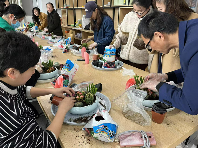 園藝?yán)蠋熓紫仍敿?xì)講解了多肉植物的種類(lèi)、習(xí)性和養(yǎng)護(hù)要點(diǎn),從光照、澆水頻率到土壤選擇,事無(wú)巨細(xì),為大家后續(xù)的DIY環(huán)節(jié)筑牢知識(shí)基礎(chǔ)。隨后,在多肉盆栽DIY過(guò)程中,女教職工們充分發(fā)揮想象力與創(chuàng)造力。有的精心挑選不同形狀、顏色的多肉,巧妙搭配,營(yíng)造出層次豐富的視覺(jué)效果;有的添加可愛(ài)的小擺件,如小蘑菇等,讓盆栽充滿(mǎn)童趣與溫馨。大家相互交流、分享經(jīng)驗(yàn),現(xiàn)場(chǎng)歡聲笑語(yǔ)不斷。