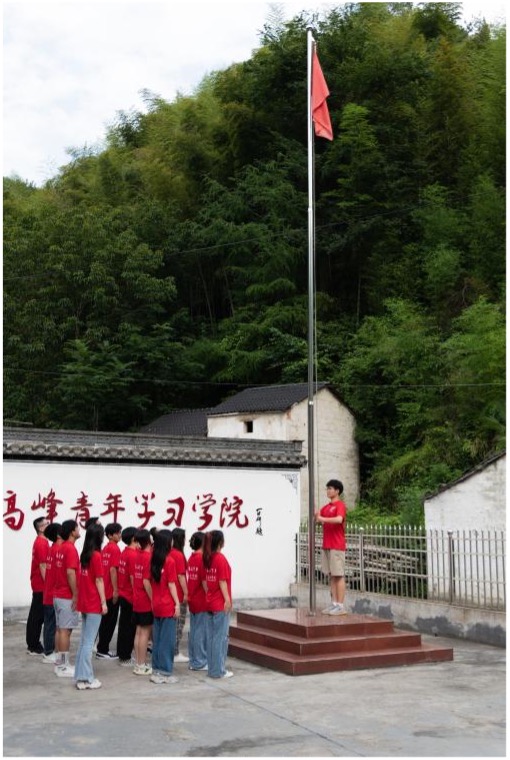 下午兩點半,三下鄉(xiāng)社會實踐重點團隊指導老師吳嫻和當?shù)卮甯刹繋ьI16名隊員穿過上世紀60年代人工開鑿的金嶺洞,前往皖南黃高峰青年學習學院參觀學習,當?shù)卮甯刹肯蜿爢T們介紹,績溪縣長安鎮(zhèn)梧川村曾是新四軍游擊隊在皖南建立的第一個革命根據(jù)地,境內(nèi)有號稱“皖南井岡山”的黃高峰、績溪縣“紅旗渠”精神教育基地“金嶺洞”、百坑會議遺址等紅色教育資源。1947年9月底,中共旌績歙寧昌工委在這里召開了為期十天的區(qū)、連級以上干部擴大會議,史稱“百坑會議”,這次會議在整個皖浙邊游擊戰(zhàn)爭史上產(chǎn)生了重大影響。宣城團市委、績溪團縣委與梧川村合作,充分挖掘整合當?shù)氐募t色資源,在百坑會議舊址上創(chuàng)辦了皖南黃高峰青年學習學院,2021年學院被確定為宣城市第二屆愛國主義教育示范基地。吳嫻老師和隊員們到達黃高峰青年學習學院后,對學院進行了參觀,我們現(xiàn)場升起國旗,共同重溫入團誓詞,當?shù)卮甯刹繋ьI參觀了青年學院,并對學院發(fā)展歷史進行了講解,全體隊員合影留念。
