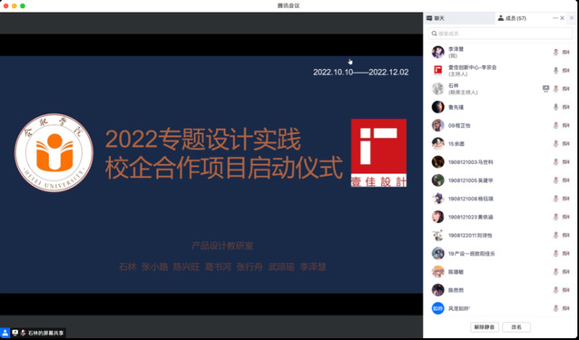 10月9日晚八時,合肥學(xué)院設(shè)計學(xué)院產(chǎn)品設(shè)計專業(yè)與壹佳設(shè)計共同開展了產(chǎn)品設(shè)計課題專題研討會。壹家設(shè)計的創(chuàng)始人及總經(jīng)理李宗會蒞臨會議講學(xué)。設(shè)計學(xué)院黨委書記魯先瑾、教學(xué)副院長潘峰、產(chǎn)品教研室主任石林等老師,以及19級產(chǎn)品設(shè)計專業(yè)學(xué)生參加了本次設(shè)計課題的線上研討會。