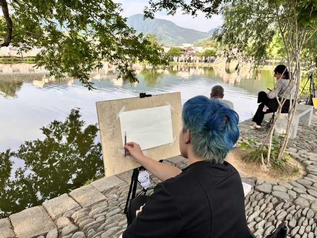 宏村素有“中國畫里鄉(xiāng)村”的美譽(yù),白墻黑瓦、綠水青山的景象,構(gòu)成了一幅“活著的水墨畫”。指導(dǎo)教師從取景、構(gòu)圖、色彩運(yùn)用等多個(gè)方面對學(xué)生進(jìn)行悉心指導(dǎo)。在老師的手把手教學(xué)中,學(xué)生們不僅掌握了色彩技法,更深刻體會到了徽派建筑的獨(dú)特魅力與建造智慧。