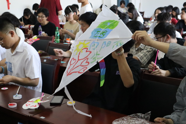 下午2:30,活動正式開始。同學(xué)們?nèi)艘唤M用事先準(zhǔn)備好的紙、筆、顏料等工具開始制作風(fēng)箏。同學(xué)們大膽想象,盡情地發(fā)揮自己的聰明才智,把風(fēng)箏畫成自己喜歡的樣子,制作好的風(fēng)箏可現(xiàn)場放飛,感受童年時的樂趣,放松身心。