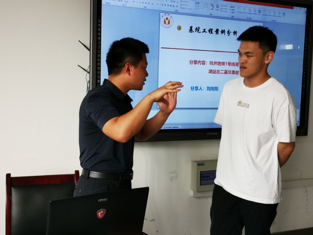 報(bào)告會(huì)中,劉向陽(yáng)博士依托杭州地鐵1號(hào)線湘湖站北二基坑垮塌事故,分別從施工和設(shè)計(jì)的角度,系統(tǒng)分析了此次事故的誘因。重點(diǎn)介紹了施工單位違規(guī)施工、冒險(xiǎn)作業(yè)、嚴(yán)重超挖的具體情況;同時(shí)也指出,設(shè)計(jì)單位在基坑穩(wěn)定分析中采用飽和重度計(jì)算抗滑力矩是不當(dāng)?shù)模以谟?jì)算地面超載的主動(dòng)土壓力時(shí)錯(cuò)誤使用了固結(jié)不排水強(qiáng)度指標(biāo)。報(bào)告會(huì)議內(nèi)容翔實(shí),引發(fā)了學(xué)生們的熱烈討論。