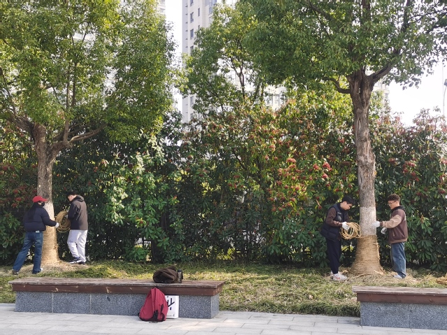 活動(dòng)伊始,在公園管理處工作人員的安排下,園林工作人員對同學(xué)們進(jìn)行了簡單的培訓(xùn),演示大樹“脫衣”過程,講解技巧與細(xì)節(jié)。學(xué)生黨員們積極熱情地投入勞動(dòng)中,耐心解開防風(fēng)麻繩,收拾整齊,以便日后回收利用。遇到粗壯的大樹,學(xué)生們兩兩配合,經(jīng)過幾個(gè)小時(shí)的努力,志愿者們終于完成了所有的任務(wù)。