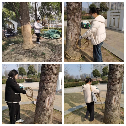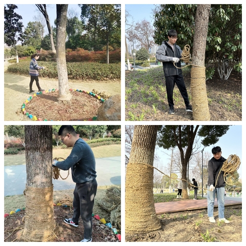 活動現(xiàn)場,研究生志愿者戴上手套,在公園樹木養(yǎng)護人員的帶領(lǐng)下,將公園中香樟樹在冬季防寒使用的護繩一一拆解、捆綁整理,最后統(tǒng)一歸納回收。大家齊動手,互相配合、分工有序、有條不紊,確保每一棵樹木在氣溫回暖時得到“解衣”。