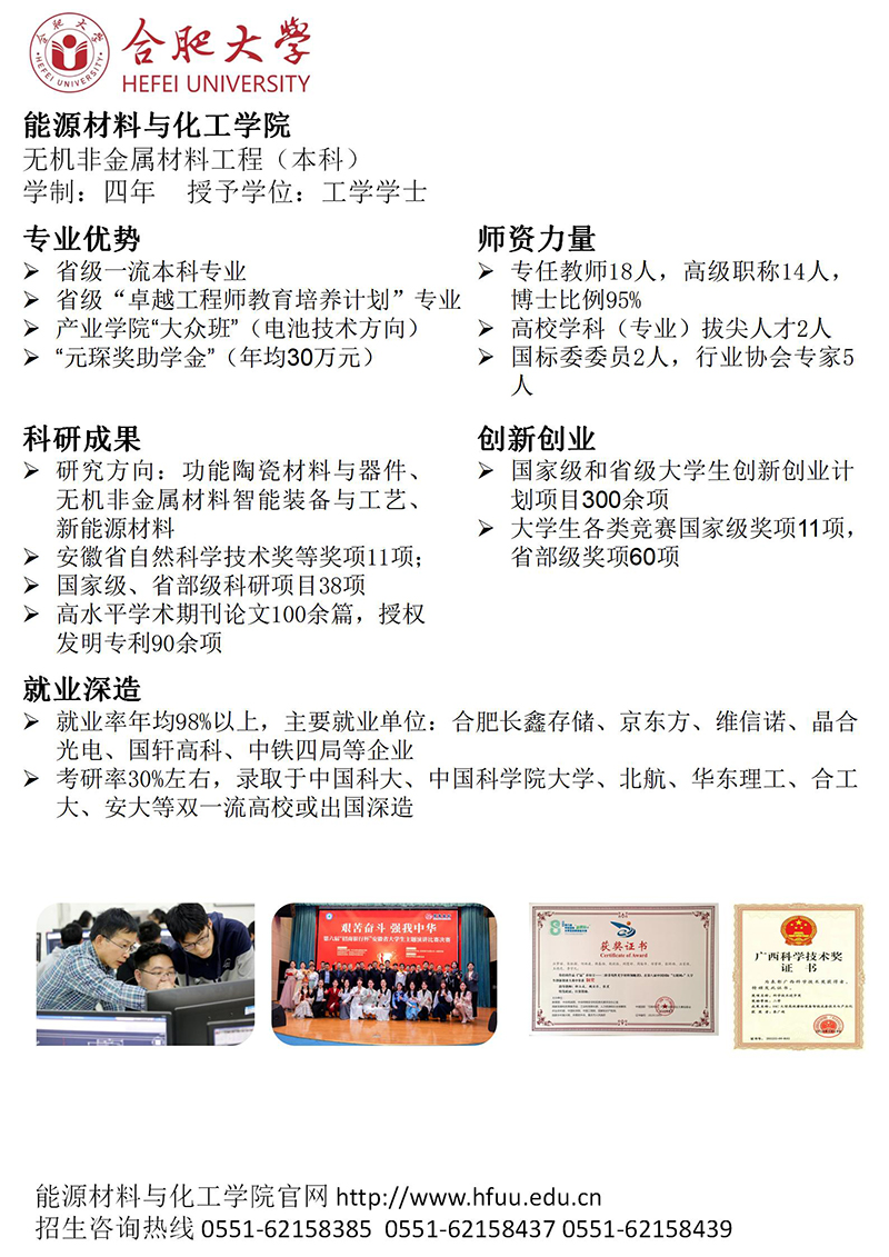 無機(jī)非金屬材料工程(本科) 咨詢電話:0551-62158385